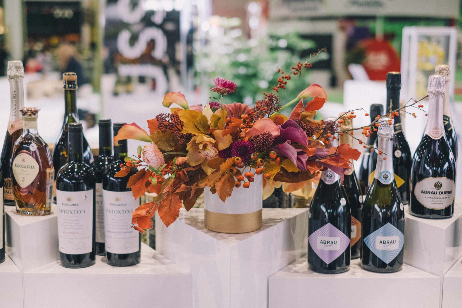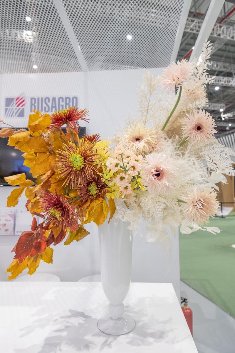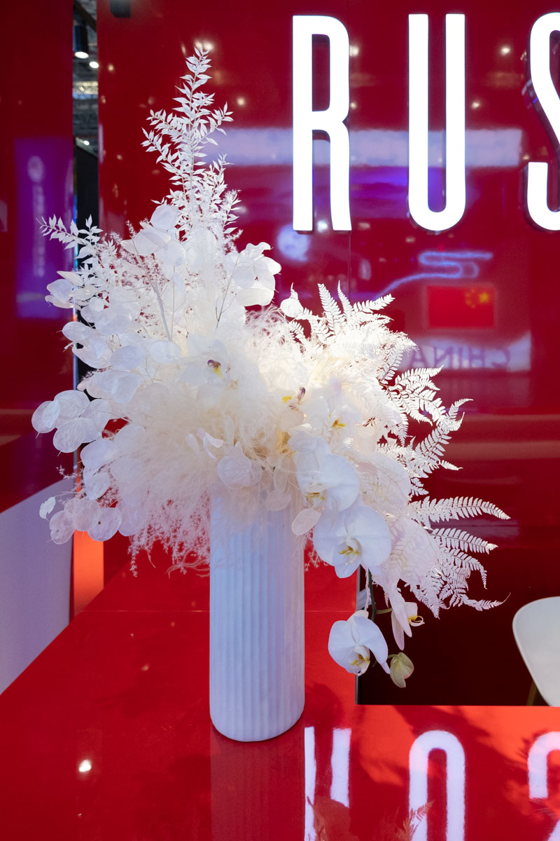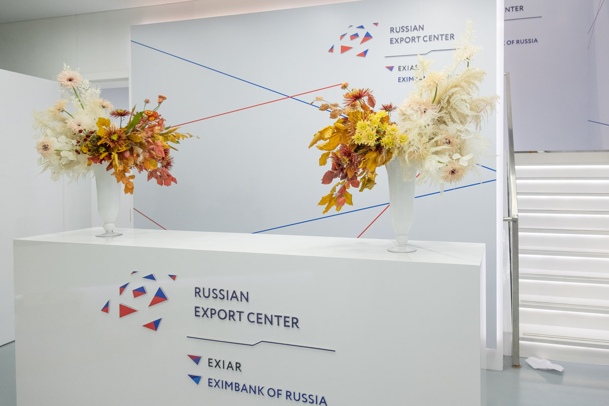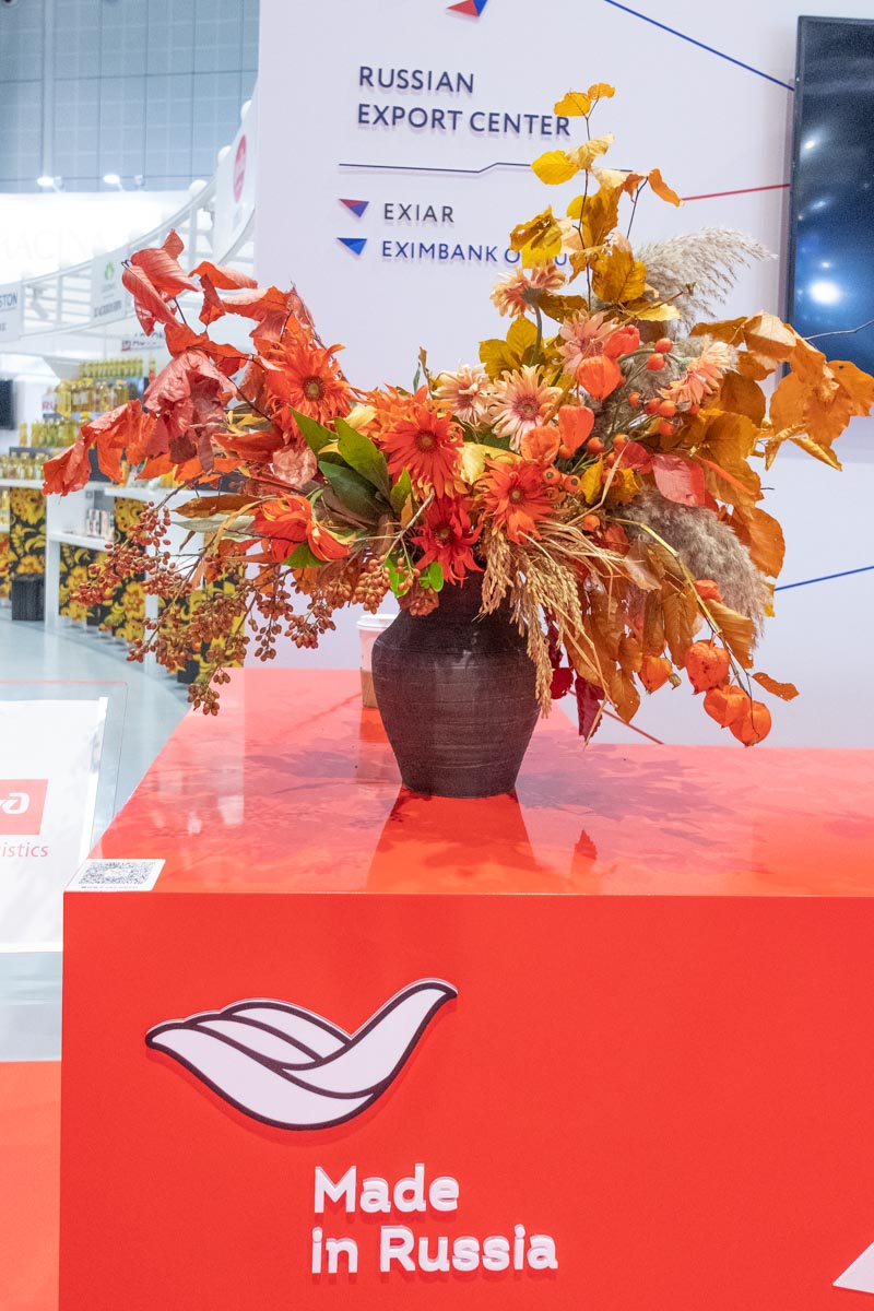 We wanted to recreate the village atmosphere and emphasise the harvest theme. Therefore, we used meadow grasses and tiny flowers with small blooms, seasonal cereals and berries. The color palette consisted of yellow, orange and red which refer to the warmth and brightness of autumn. Separately stands a white flower arrangement for the Countries Pavilion because it represents scientific and technological achievements of Russia.